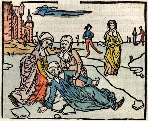 schaatsen op de dichtgevroren Maas. Houtsnede 1496