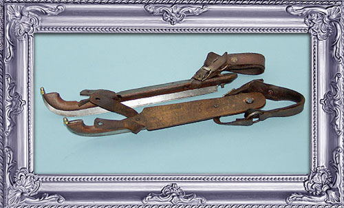 Afbeelding van een Zwanenschaats. Prachtig gemaakte gestileerde 'Zwaantjes'. Anonieme handgemaakte schaatsjes. Bergambachterschaats met koperen voetplaten De originele verpakking van hierboven afgebeelde schaatsen. Advertentie: smeden gevraagd. Aluminium doorlopers van Batavus ± 1940 IJsklompen Marker ijsklompen Onderbindijzers tegen uitglijden Zakmesje in de vorm van een schaatsje, lengte ingeklapt 8,6 cm